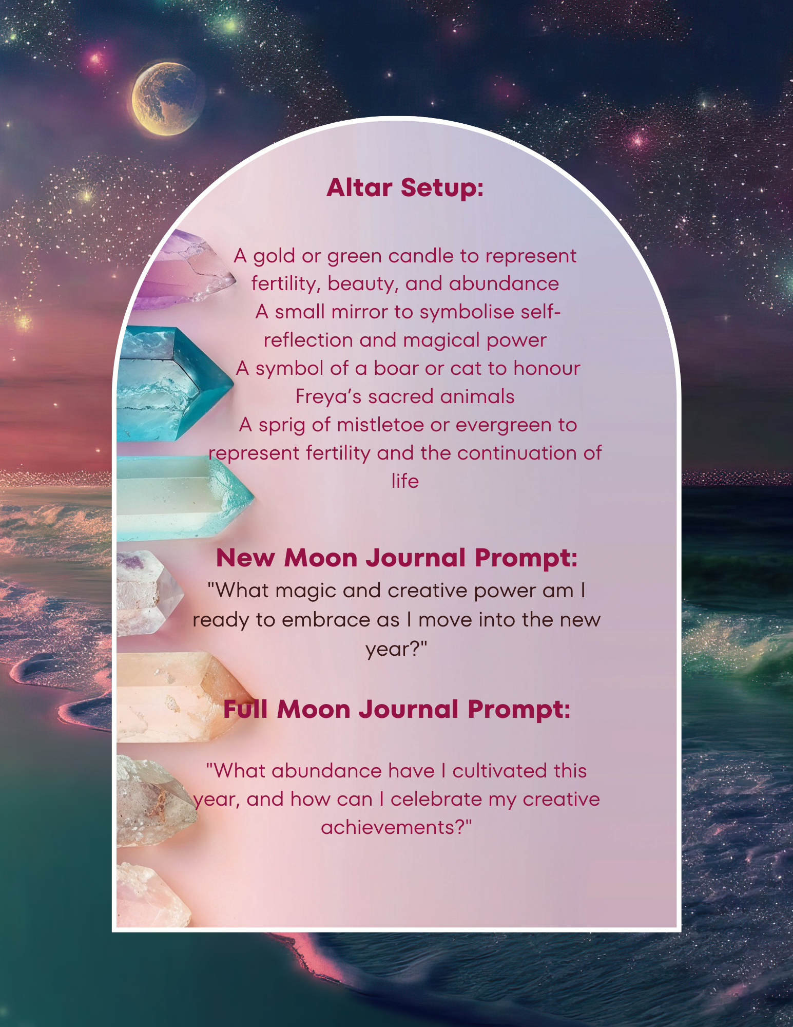 Each month highlights a Goddess whose qualities resonate with the lunar energy. For example, Aphrodite (February) inspires self-love, beauty, and emotional fulfillment. This helps you align with these qualities in your life.Full & New Moon Guidance