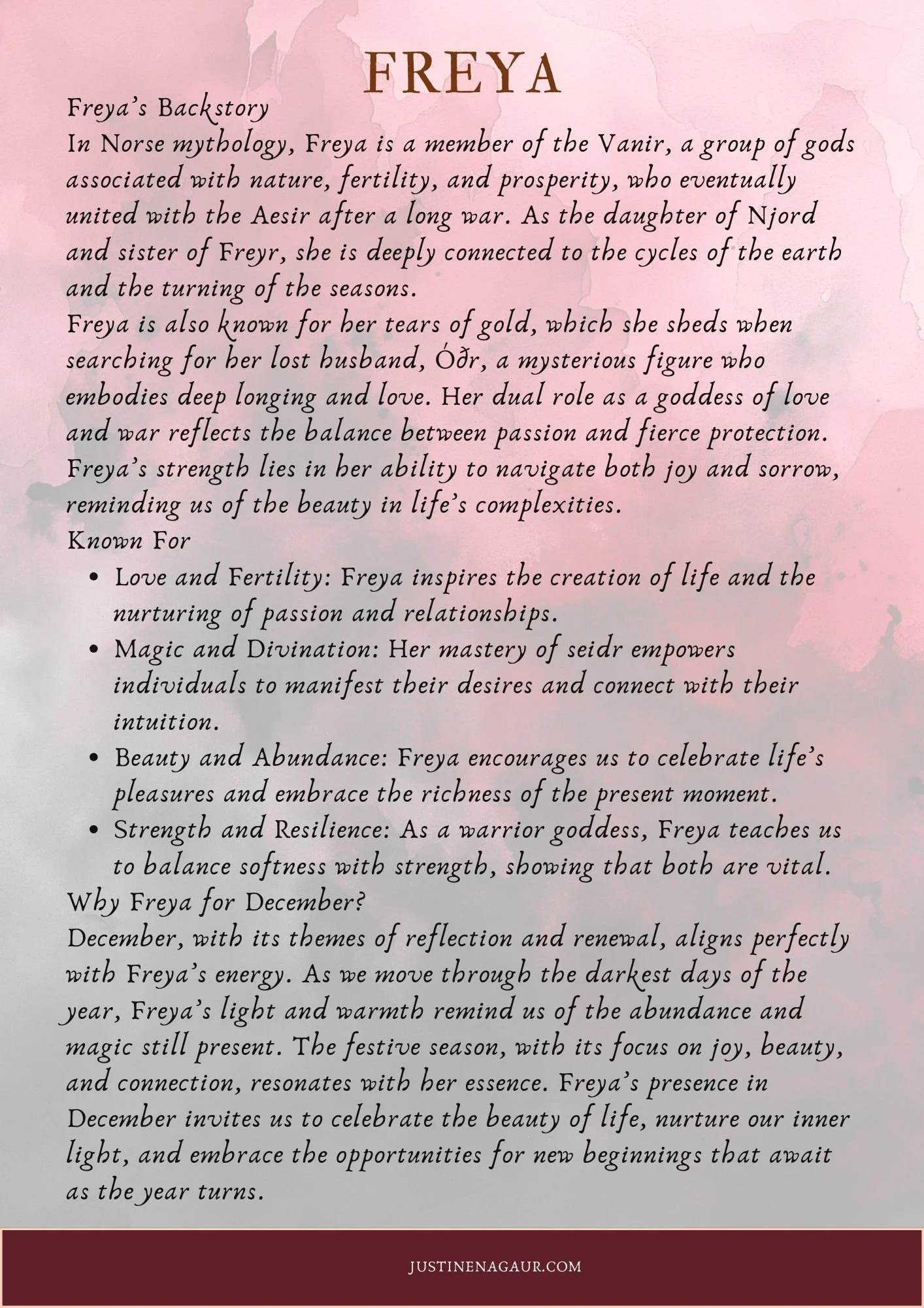 Each month, we journey into the profound energies of a specific Goddess, drawing inspiration from her mythos, symbols, and teachings. This immersive experience is designed to align with the cycles of the moon and the seasonal energies, fostering personal growth, self-discovery, and empowerment. Together, we explore her light and shadow aspects, reflecting on her relevance to the time of year and how her wisdom can support our emotional, spiritual, and energetic wellbeing. Participants will deepen their connection to these divine archetypes through guided meditations, reflective writing, and actionable insights for integration into daily life.